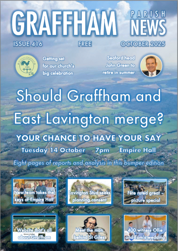 October 2025’s edition of Graffham Parish News is out now – and it’s one our biggest and busiest yet, at 76 pages. The front cover previews the joint meetings of the civil parishes of Graffham and East Lavington to consider a potential merger between the two, with eight pages of background and analysis inside. Also featured are previews of November’s special service to mark the 150th anniversary of the rebuilding of our St Giles parish church, news of a new website for Graffham, the retirement next year of Seaford College headmaster John Green, the planning application lodged by Lavington Stud and Estate, and the new team holding the keys of the Empire Hall. There are lots of pictures of Graffham’s August Bank Holiday fete and of the wedding of Three Moles landlords Tom and Ollie, plus all the regular features. If you haven’t received your copy yet, or you live outside the village, you can read it online here.